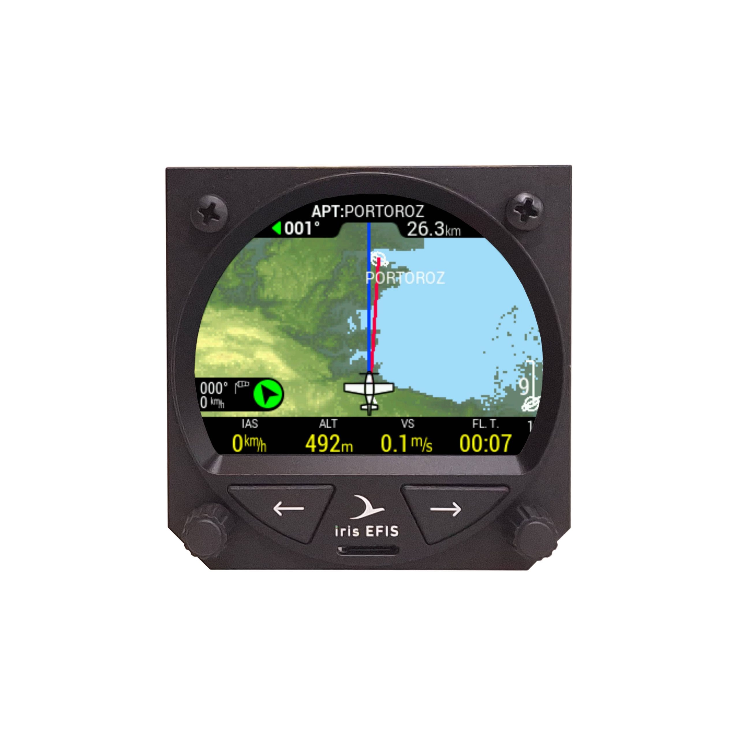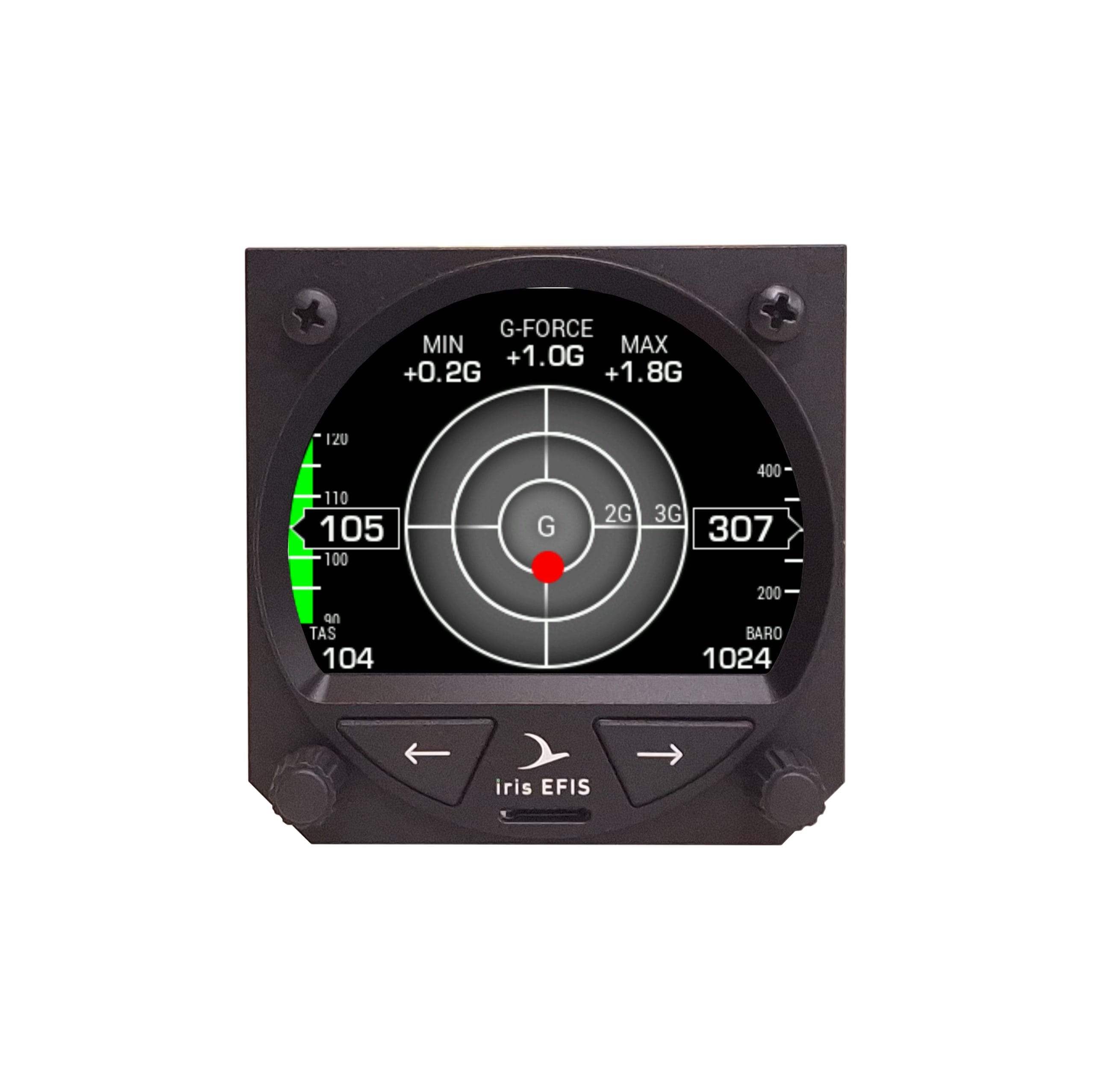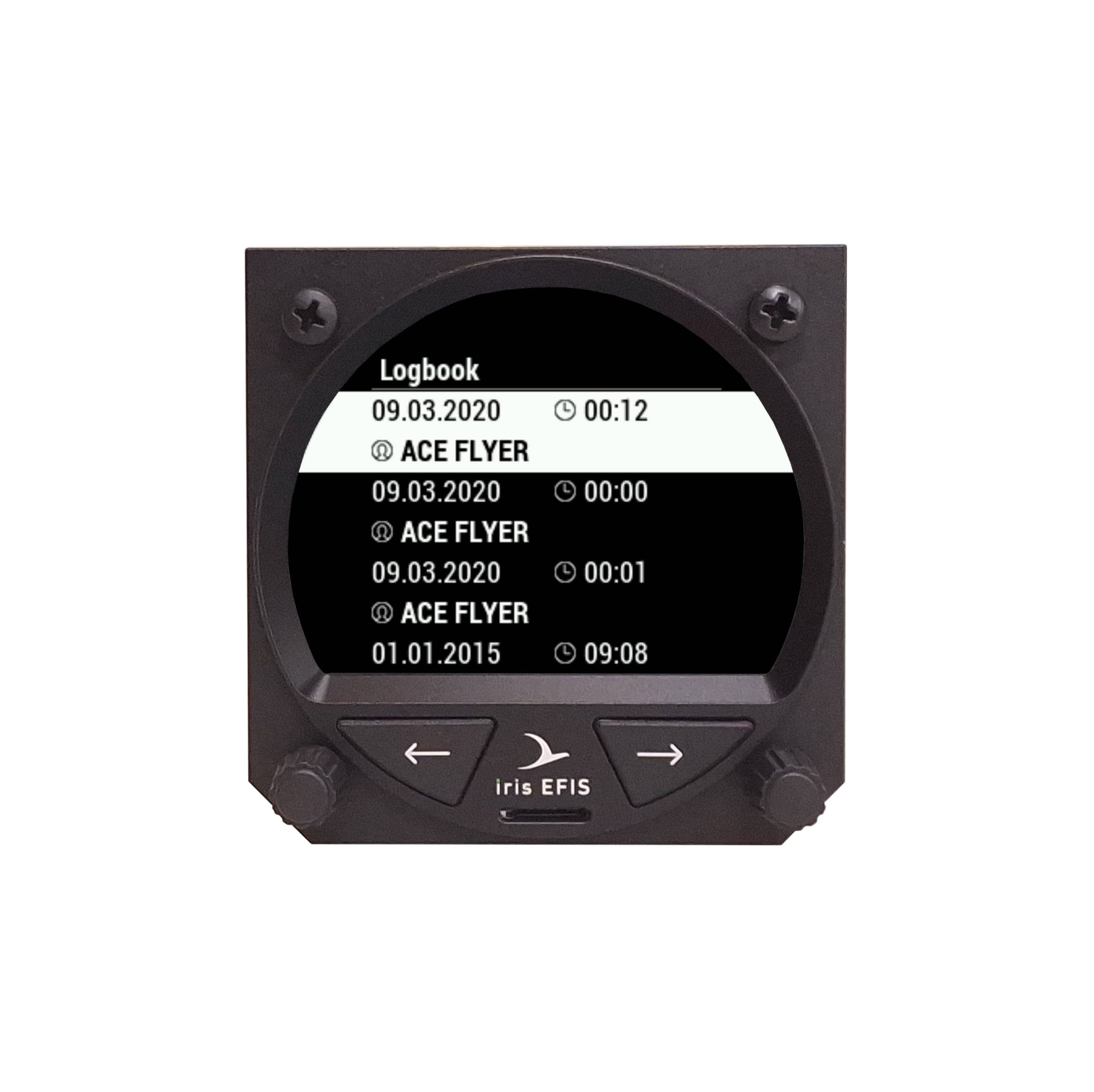 With iris EFIS pro you will get Route (RTE) and Airport (APT) navigation with airspace support and 3D terrain maps with 12 different color palettes, G-force page, Logbook and much more.